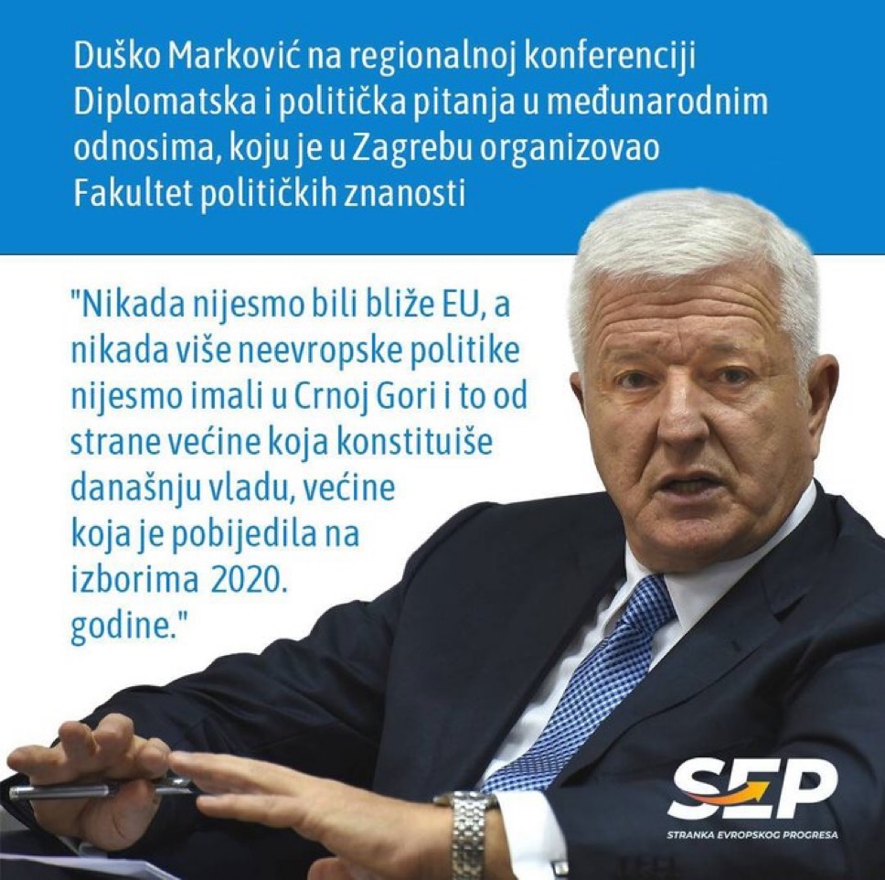 „Ja kada na ovu temu (EU integracije) govorim u Crnoj Gori, kažem da nas je Evropska unija uzela u naručje i nosi nas intenzivno ka svom članstvu i sada je samo pitanje da Crna Gora ne ispadne iz toga naručja. A vrlo često smo na ivici ispadanja, skoro svakog dana smo na ivici ispadanja. … Nikada nijesmo bili bliže Evropskoj uniji, a nikada više neevropske politike nijesmo imali u Crnoj Gori i to od strane većine koja konstituiše današnju vladu, većine koja je pobijedila na izborima 2020. godine“, kazao je Duško Marković na regionalnoj konferenciji Diplomatska i politička pitanja u međunarodnim odnosima, koju je u Zagrebu organizovao Fakultet političkih znanosti.