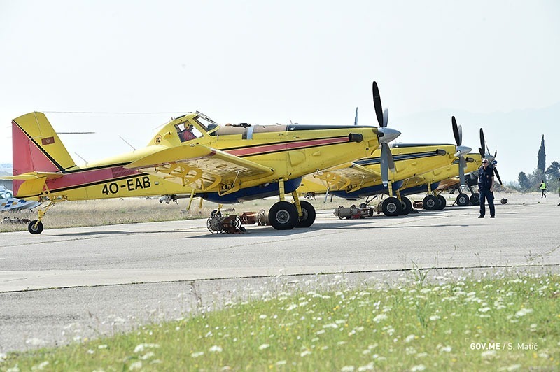 FOTO: Aerodrom u Golubovcima, 11. april 2020, tada ispravni crnogorski protivpožarni avioni Air Tractor, pred polijetanje u pomoć gašenju požara u BiH (Vlada CG)